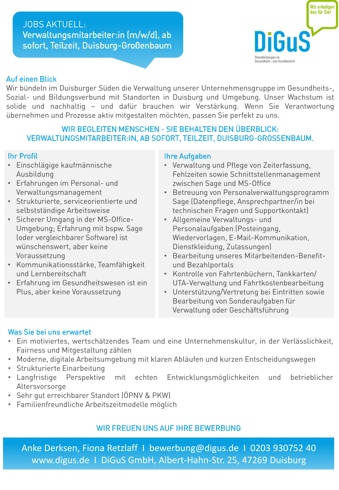 Wir begleiten Menschen - Sie behalten den Überblick: Verwaltungsmitarbeiter:in, ab sofort, Teilzeit, Duisburg-Großenbaum.