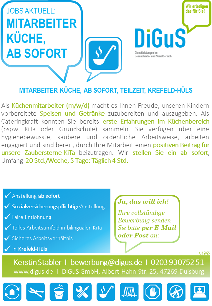 MITARBEITER (M/W/D) KÜCHE, KREFELD-HÜLS, AB SOFORT